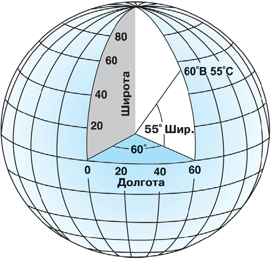 Широтой точки называется угол, образованный отвесной линией в данной точке и плоскостью экватора. Этот угол отсчитывается от плоскости экватора на север или на юг, изменяясь от 0 до 90. Широта бывает северная (+) и южная (-).