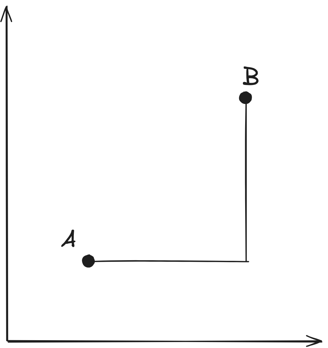 \[ d\:(A,B)=|X_B-X_A| +|Y_B-Y_A| \]