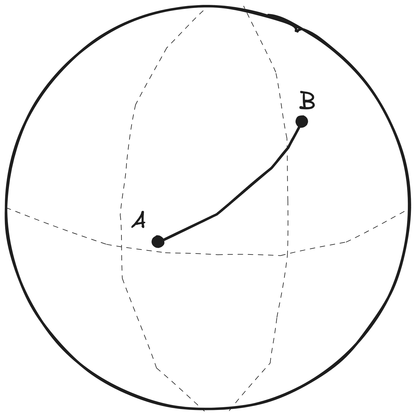 \[ d\:(A,B)=arccos(sin\,\phi_𝐴\: sin\,\phi_𝐵+cos\,\phi_𝐴\:cos\,\phi_𝐵\:cos(\lambda_𝐴−\lambda_𝐵)) \]