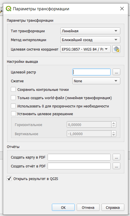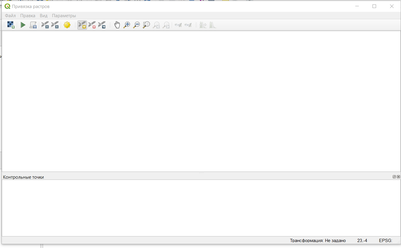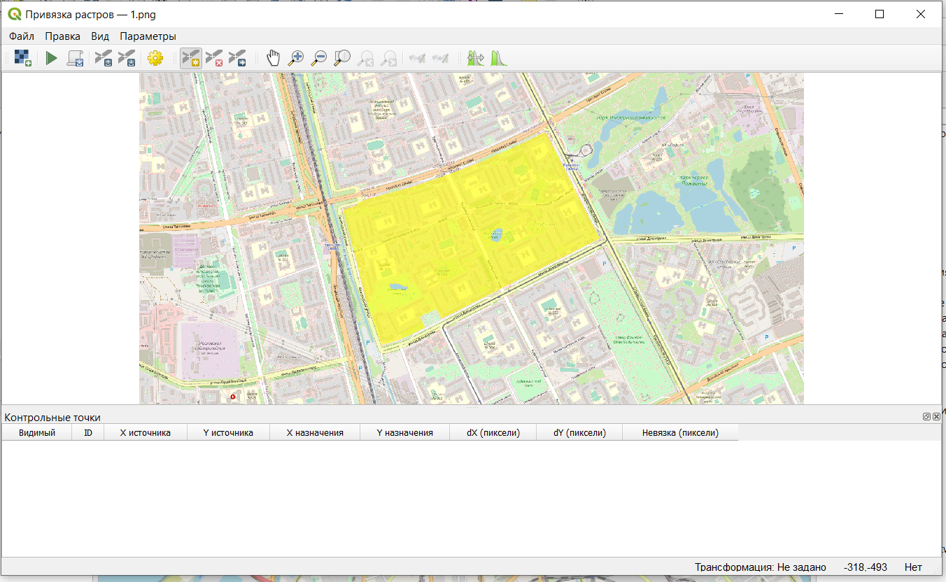 В первую очередь нужно задать или проверить параметры трансформации растра (в строке меню Параметры \(\longrightarrow\) Параметры трансформации).