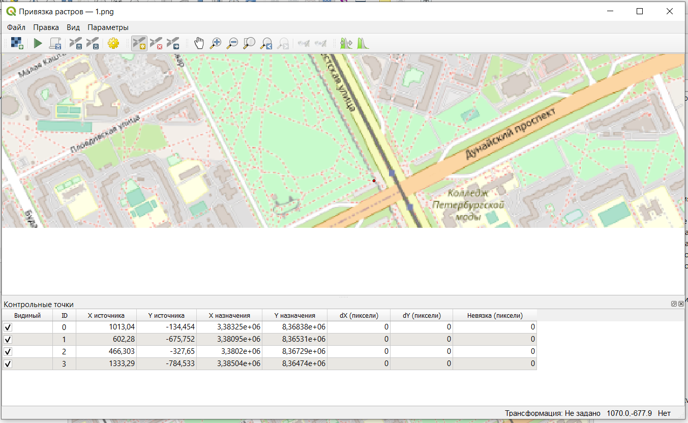 Для различных вариантов трансформации рекомендуется разное минимальное число контрольных точек, но, как правило, общая рекомендация использовать не менее 3 точек. Желательно, чтобы эти точки не были расположены на одной линии.