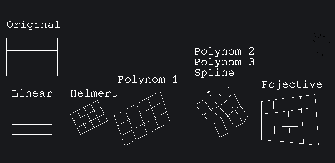 Тип трансформации будет определять манипуляции, выполняемые с растром: это может быть просто линейный пересчет координат или вместе с масштабированием и растяжением.