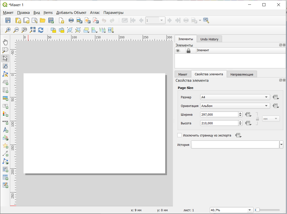 По левому краю расположены значки добавления различных элементов оформления на макет, в правой части окна сверху будут перечислены добавленные на макет элементы, а в правой нижней части окна будут отображаться свойства элементов. В центральной части расположен лист, на котором будет размещаться карта и добавленные на нее элементы.