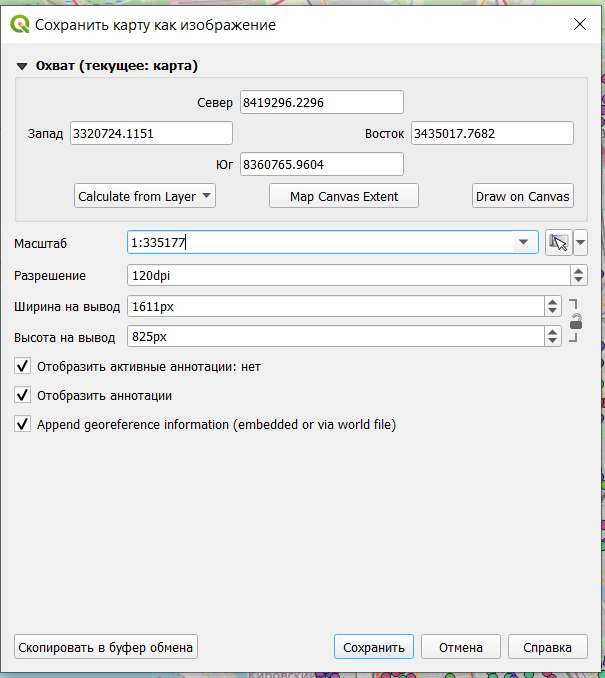 В открывшемся окне можно настроить масштаб, охват карты, разрешение, аннотации и прочее. Но такой метод не позволяет сделать некоторые точные настройки экспорта.
