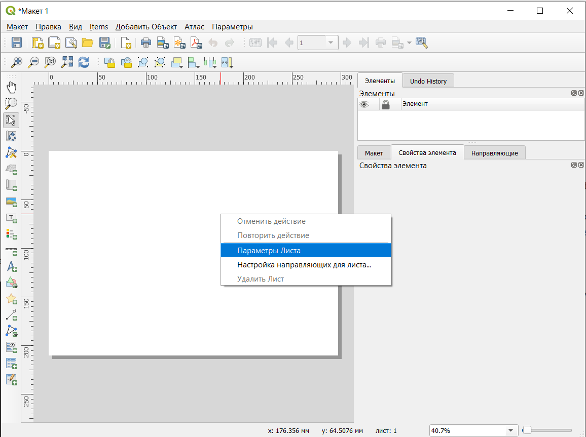 Чтобы настроить размер и ориентацию листа, нужно открыть его параметры. Параметры листа открываются в контекстном меню, которое появляется после нажатия правой кнопкой мыши на лист.