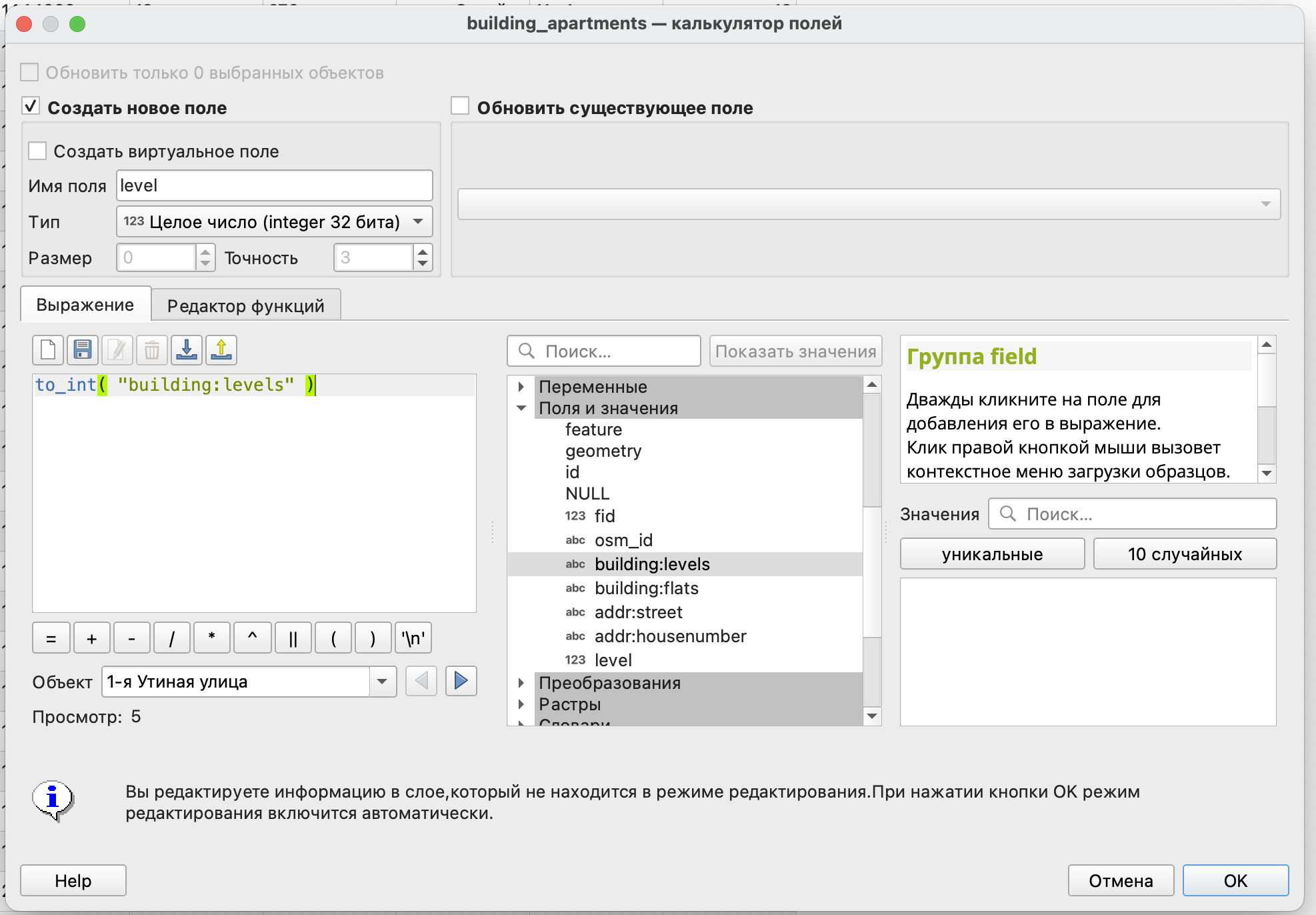 По результатам применения функции вы получите новое поле, в котором будет содержаться значение этажности в виде числа.