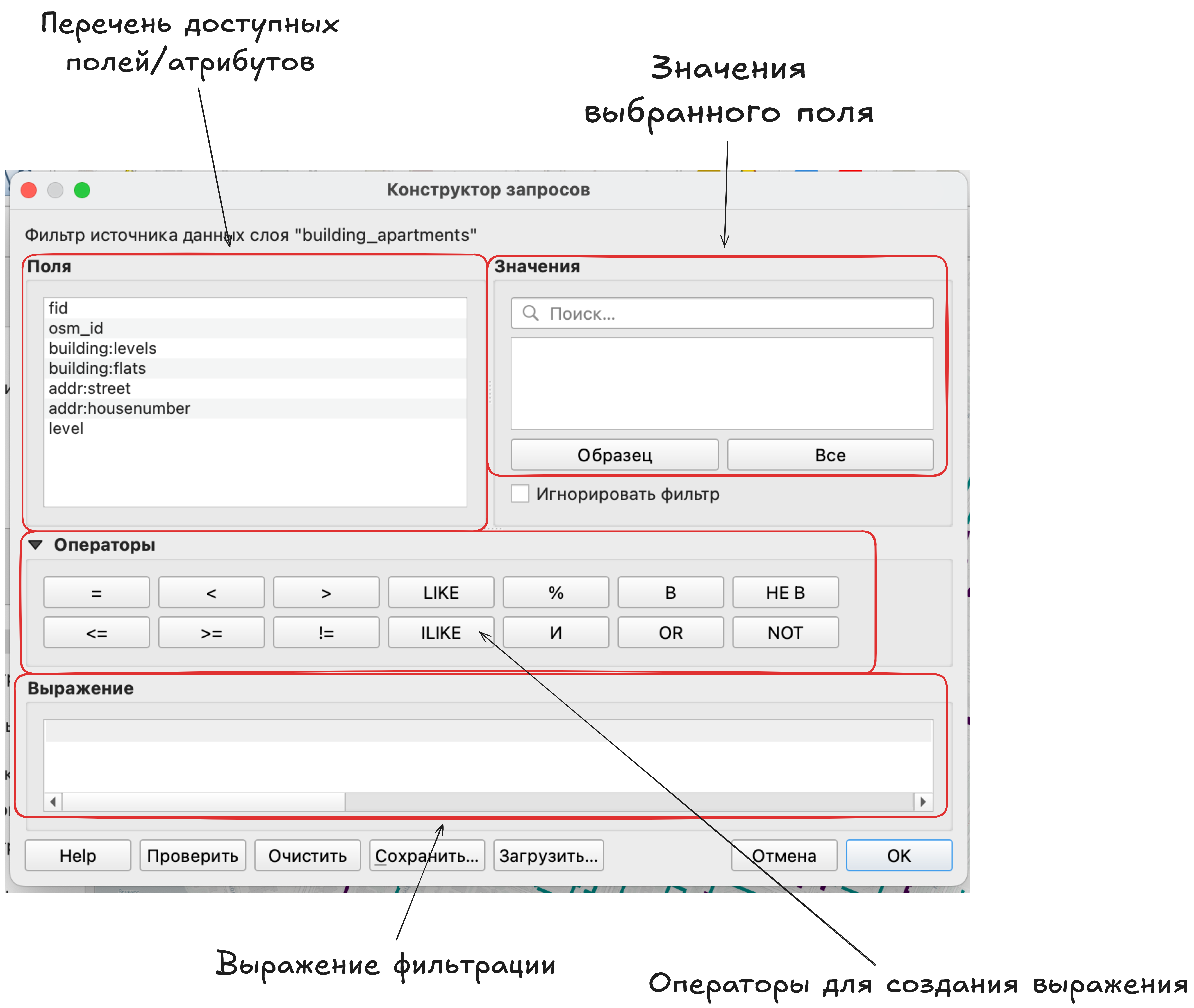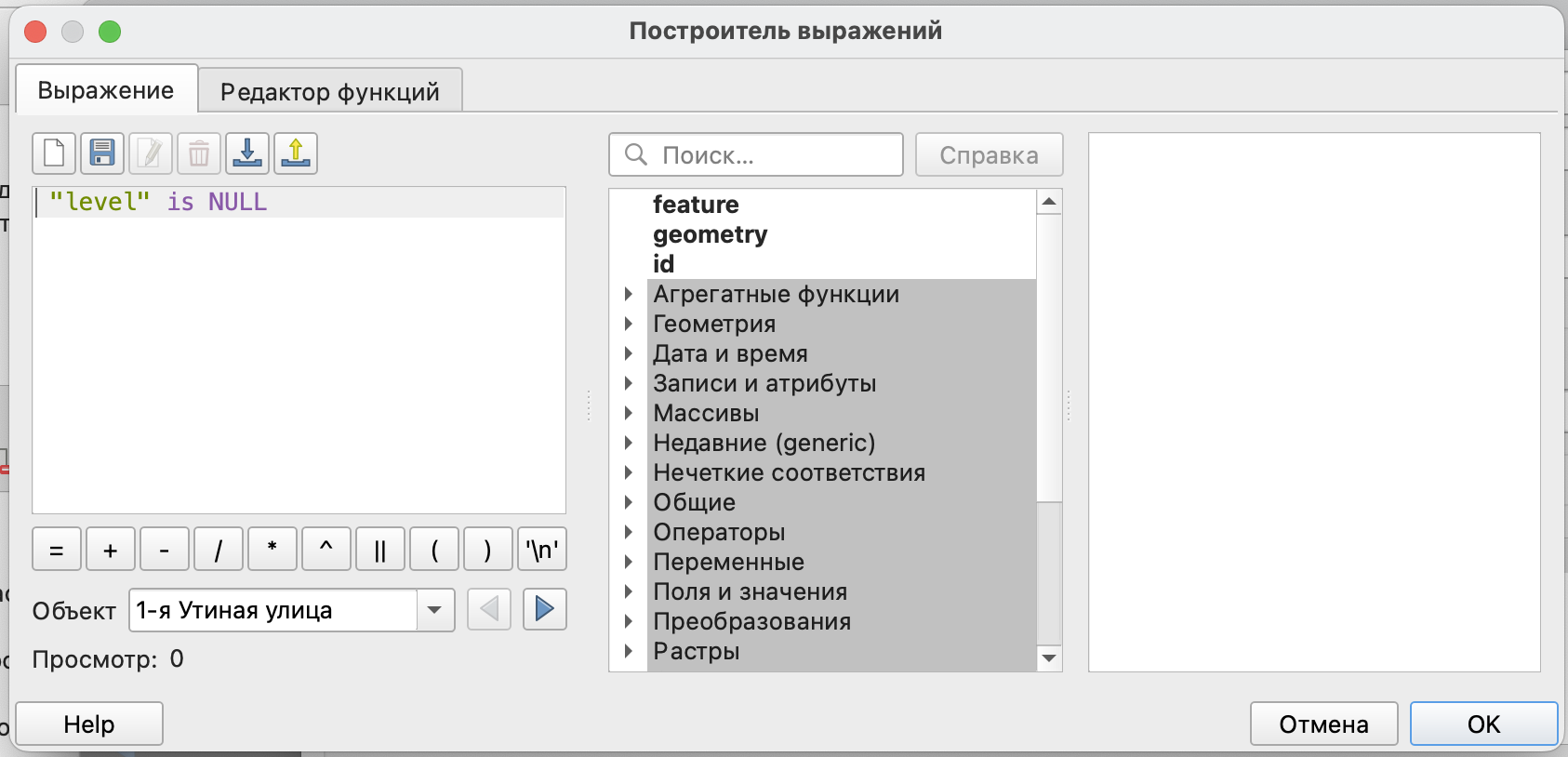 . Этот конструктор аналогичен конструктору выражений в калькуляторе полей (за исключением создания нового поля или записи результата в существующее поле, так как это выражение не будет влиять на содержание таблицы атрибутов).