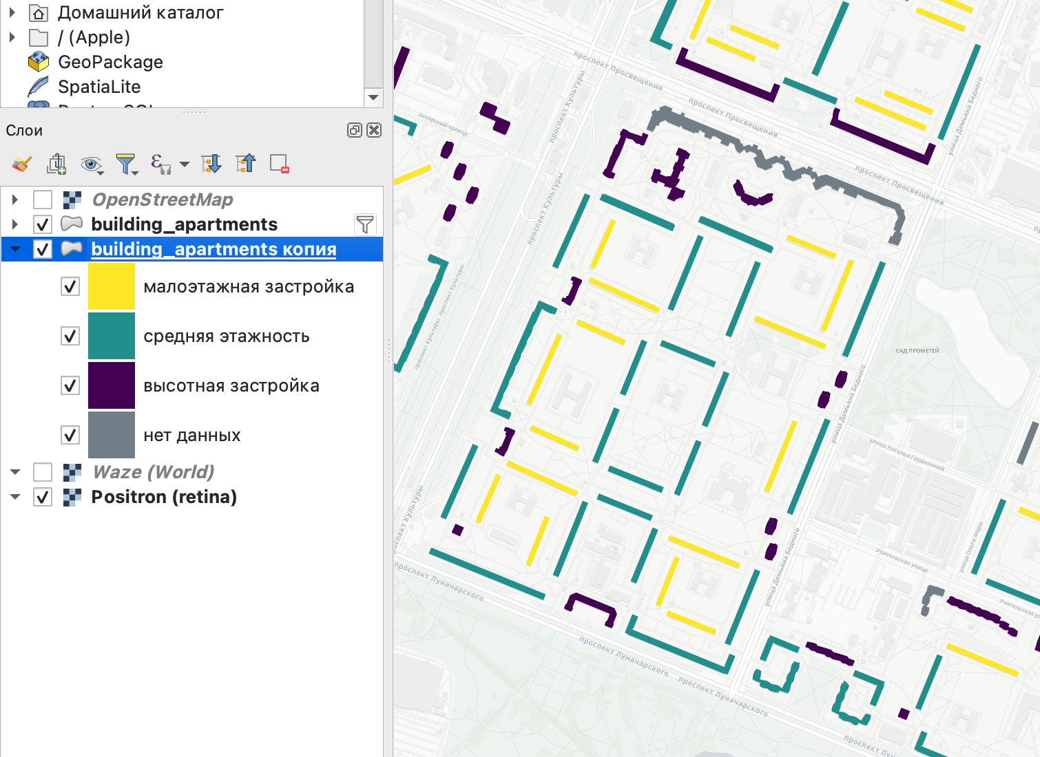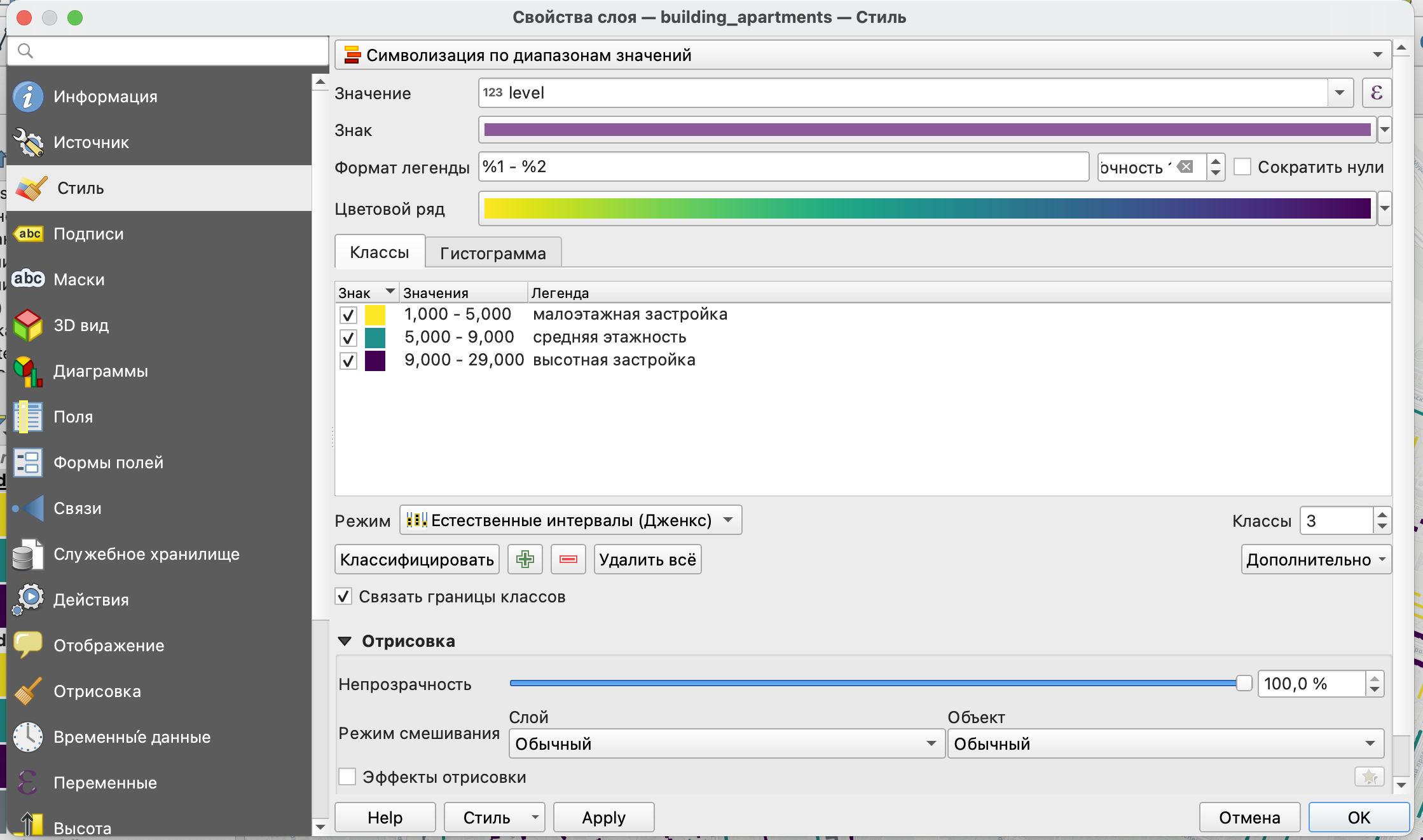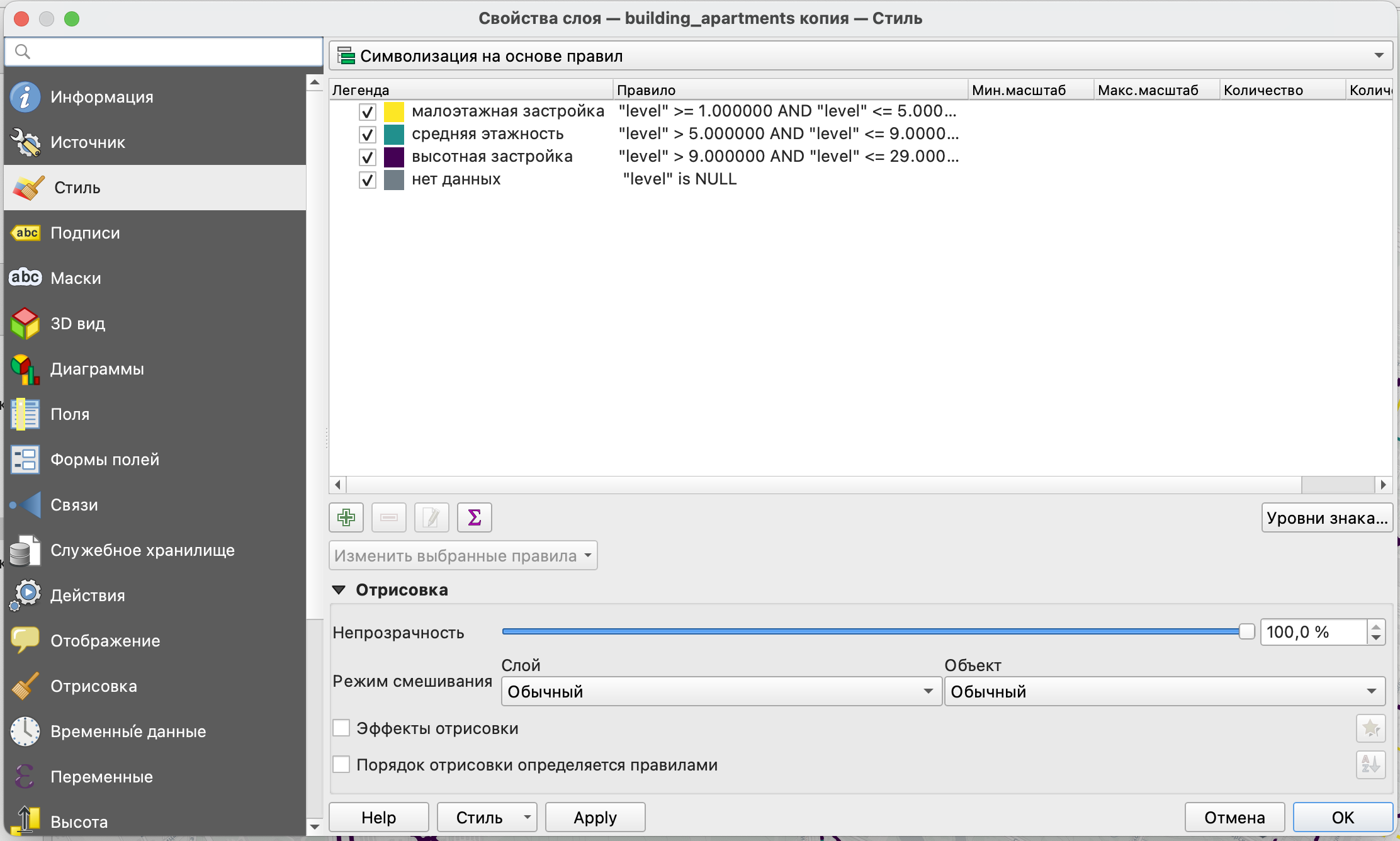 Рассмотрим настройку стиля объектов для жилых многоквартирных зданий по значению этажности.