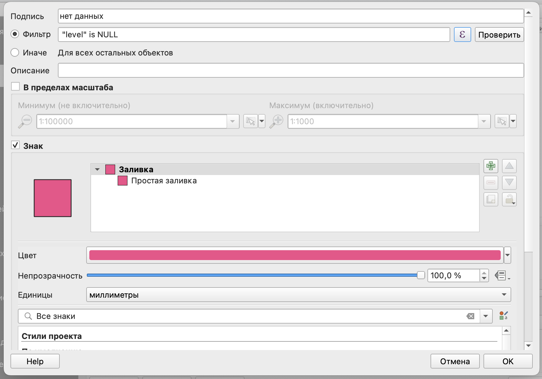, после чего в открывшемся окне указать подпись (то, что будет использоваться легенде) и выражение для правила: "level" is null.