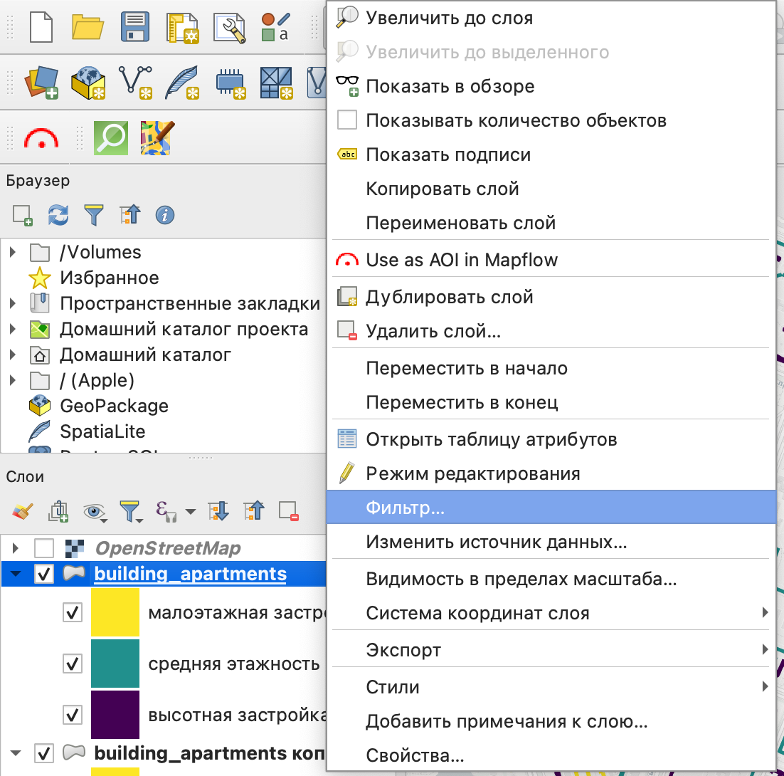 После применения фильтра количество объектов на карте и в таблице атрибутов уменьшиться, перестанут отображаться объекты, не соответствующие условию в выражении фильтрации.