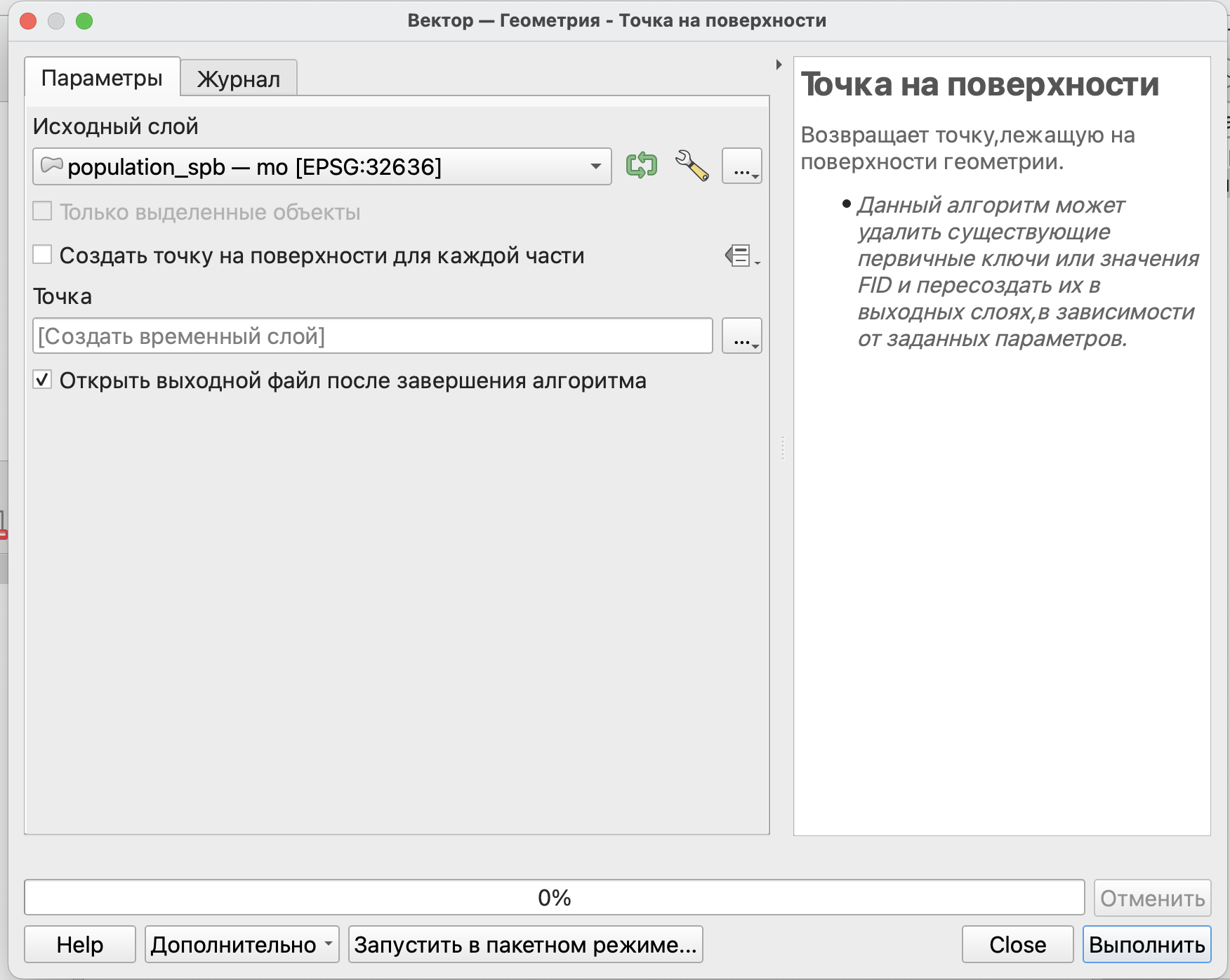 Этот инструмент дублирует инструмент Центроид с одной небольшой разницей: в случае невыпуклого многоугольника при использовании Центроида точка будет лежать за пределами полигона, тогда как при использовании Точки на поверхности точка будет смещена внутрь.