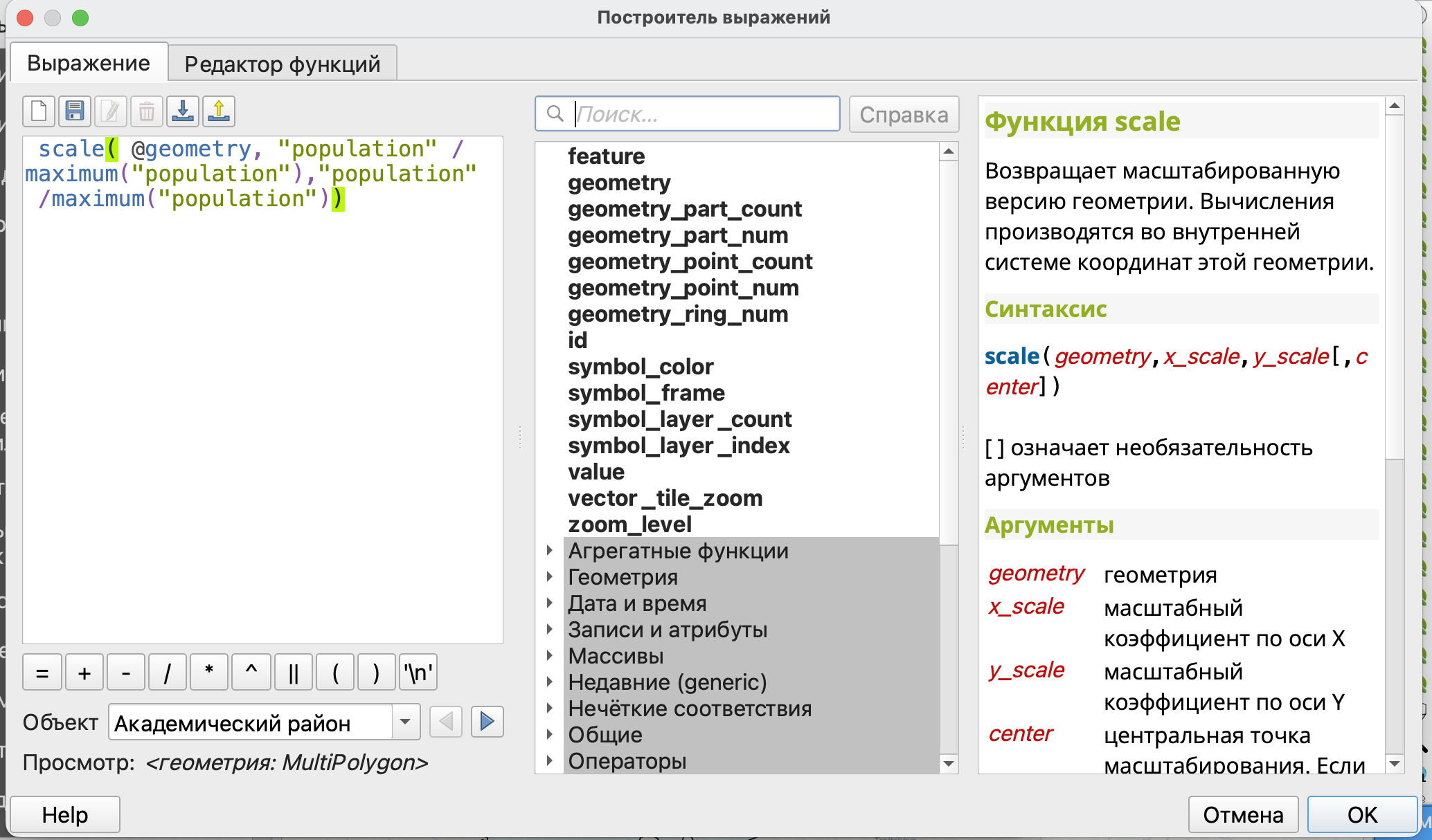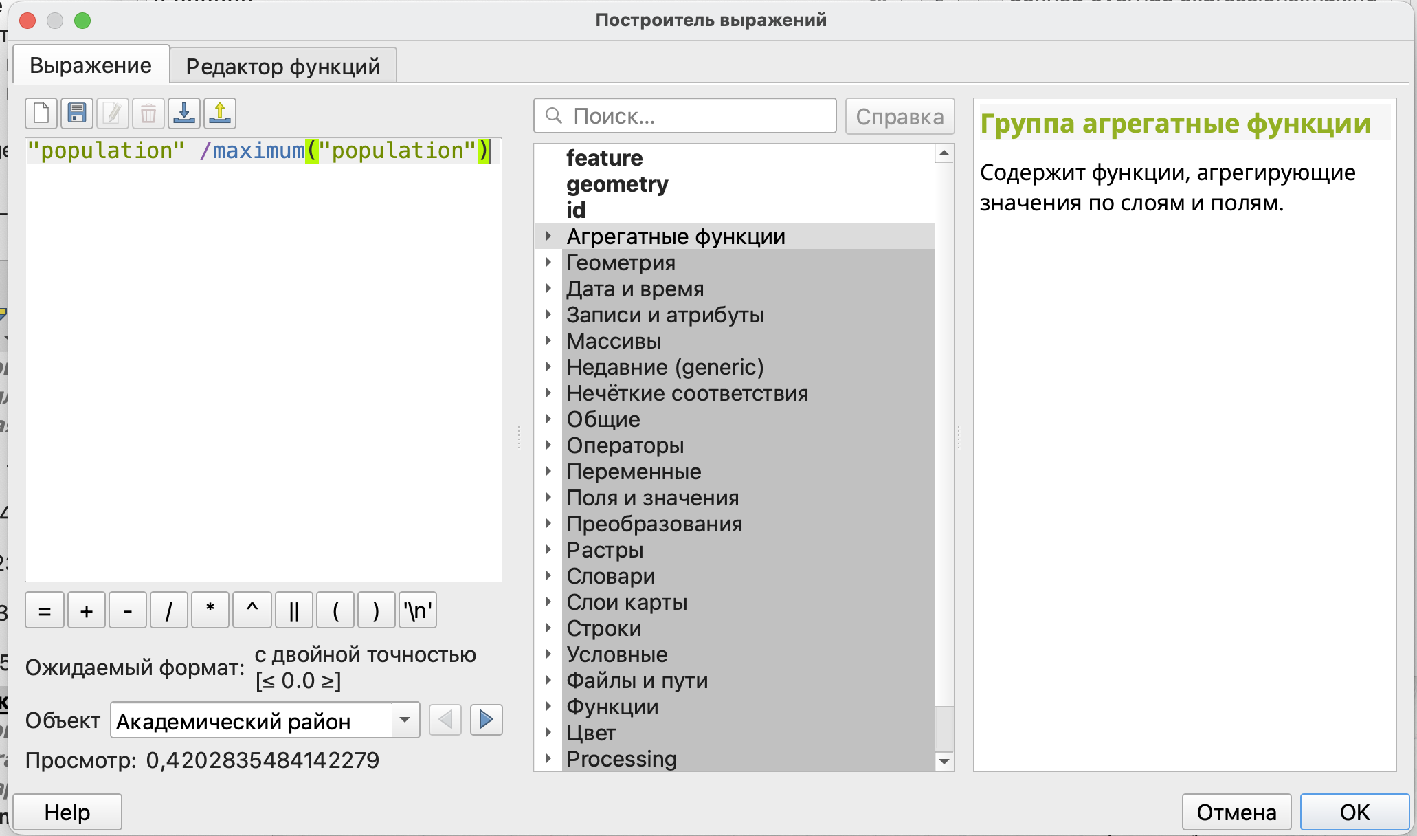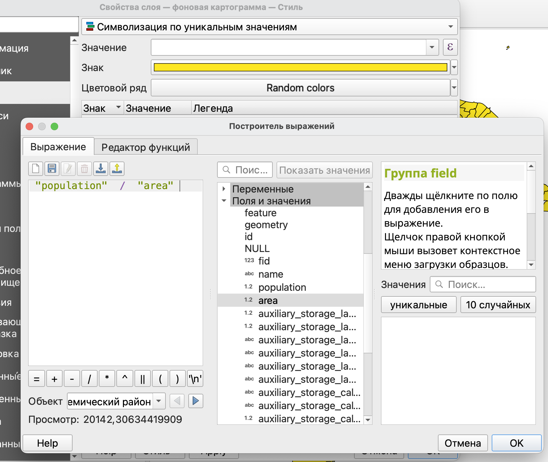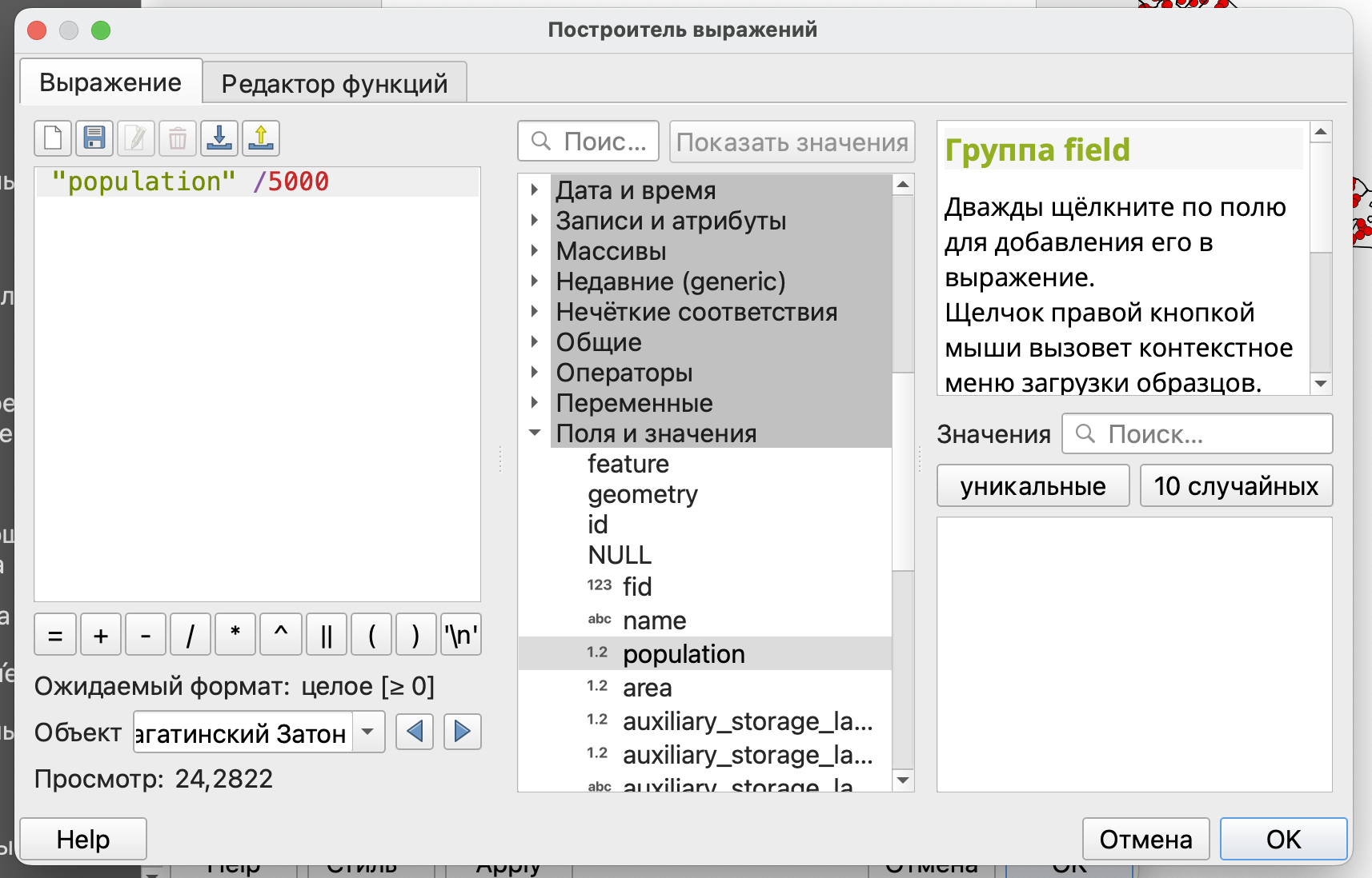 В наших исходных данных в таблице атрибутов приведено именно количество населения, поэтому необходимо перейти от него к плотности. Сделать это можно двумя способами: рассчитав плотность как отдельный атрибут с использованием калькулятора полей или воспользоваться выражением вместо конкретного атрибута при задании стиля символа.