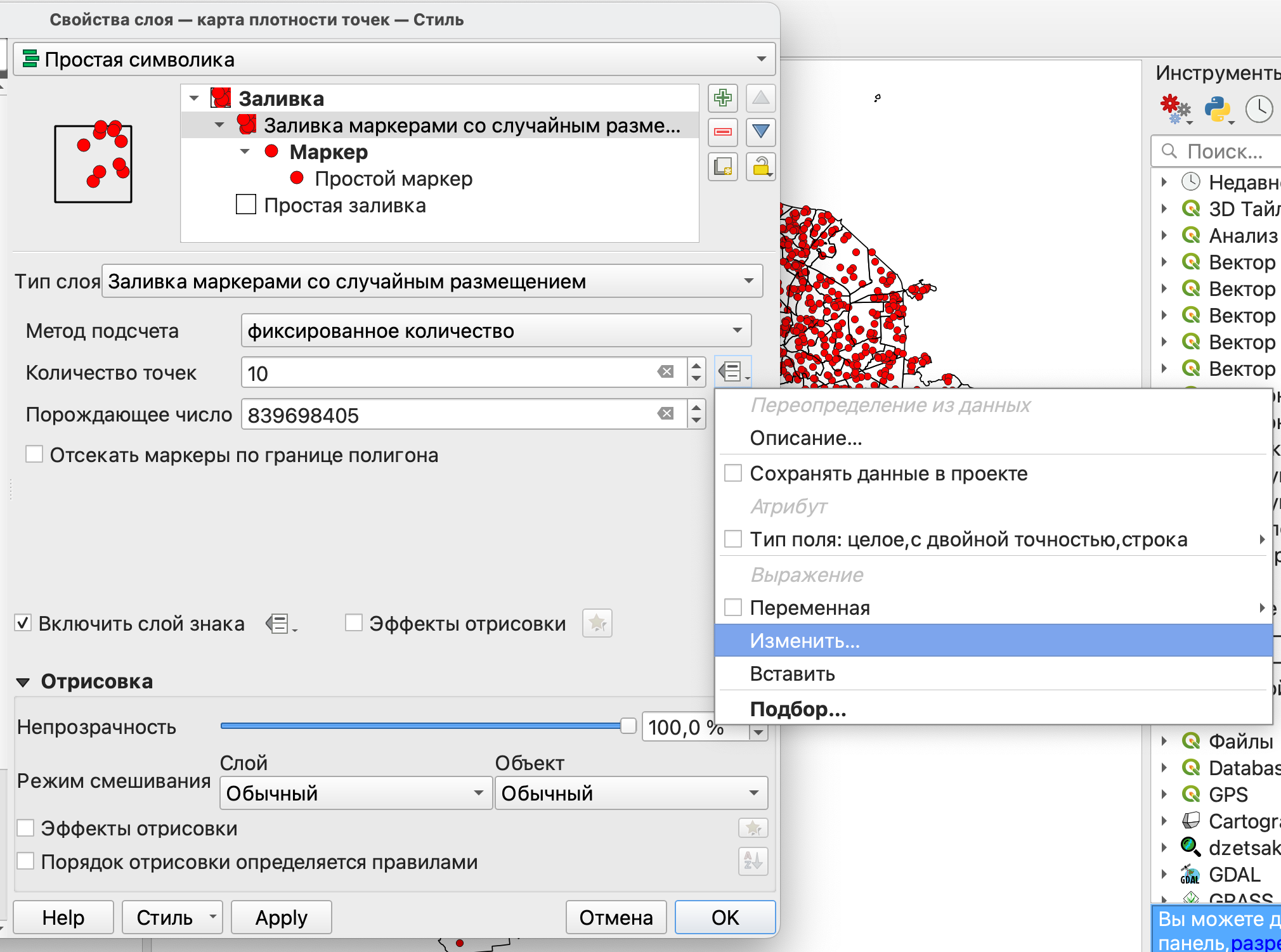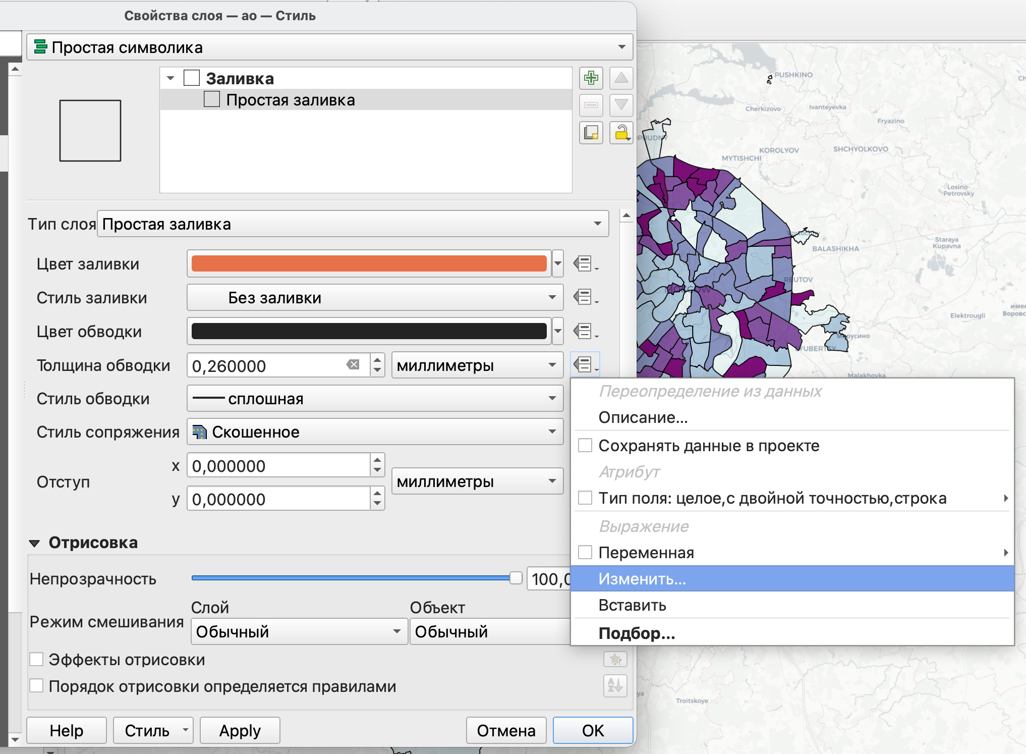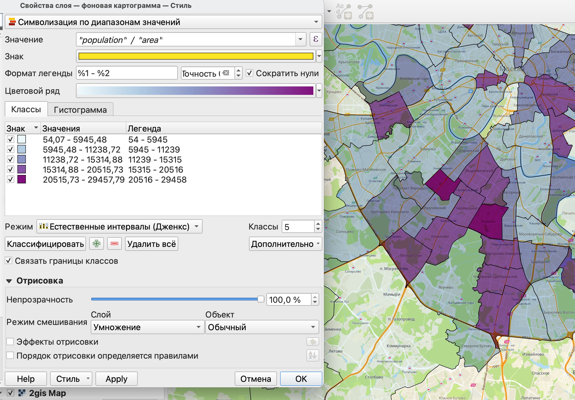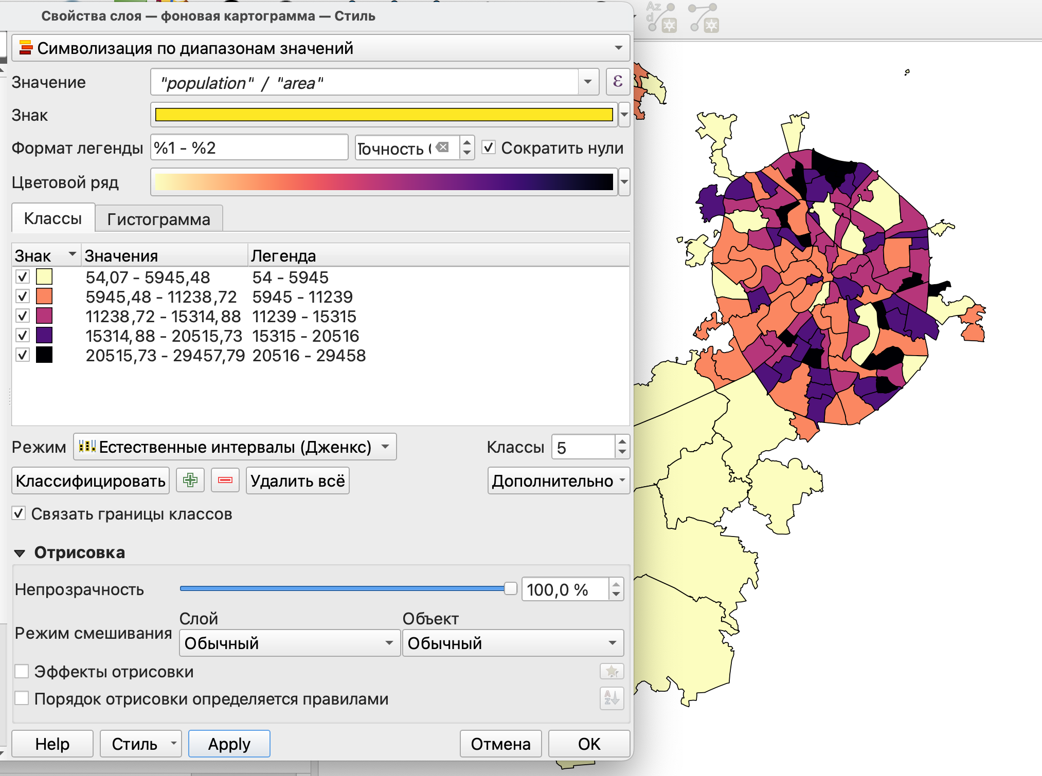 В наших исходных данных в таблице атрибутов приведено именно количество населения, поэтому необходимо перейти от него к плотности. Сделать это можно двумя способами: рассчитав плотность как отдельный атрибут с использованием калькулятора полей или воспользоваться выражением вместо конкретного атрибута при задании стиля символа.