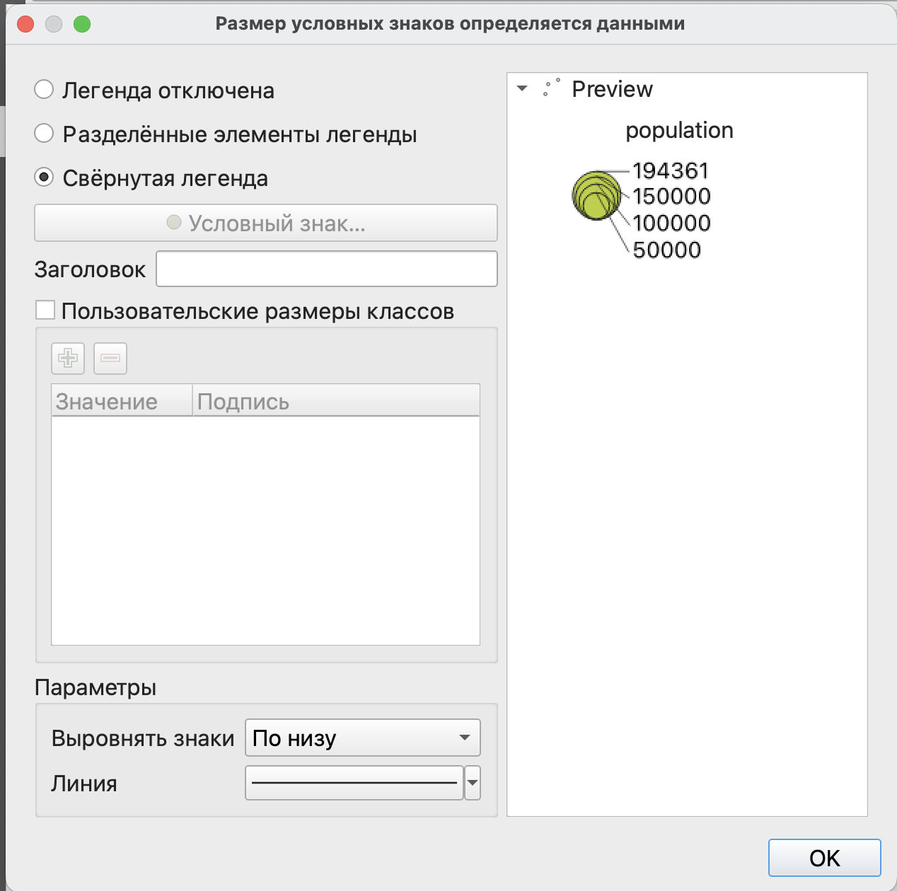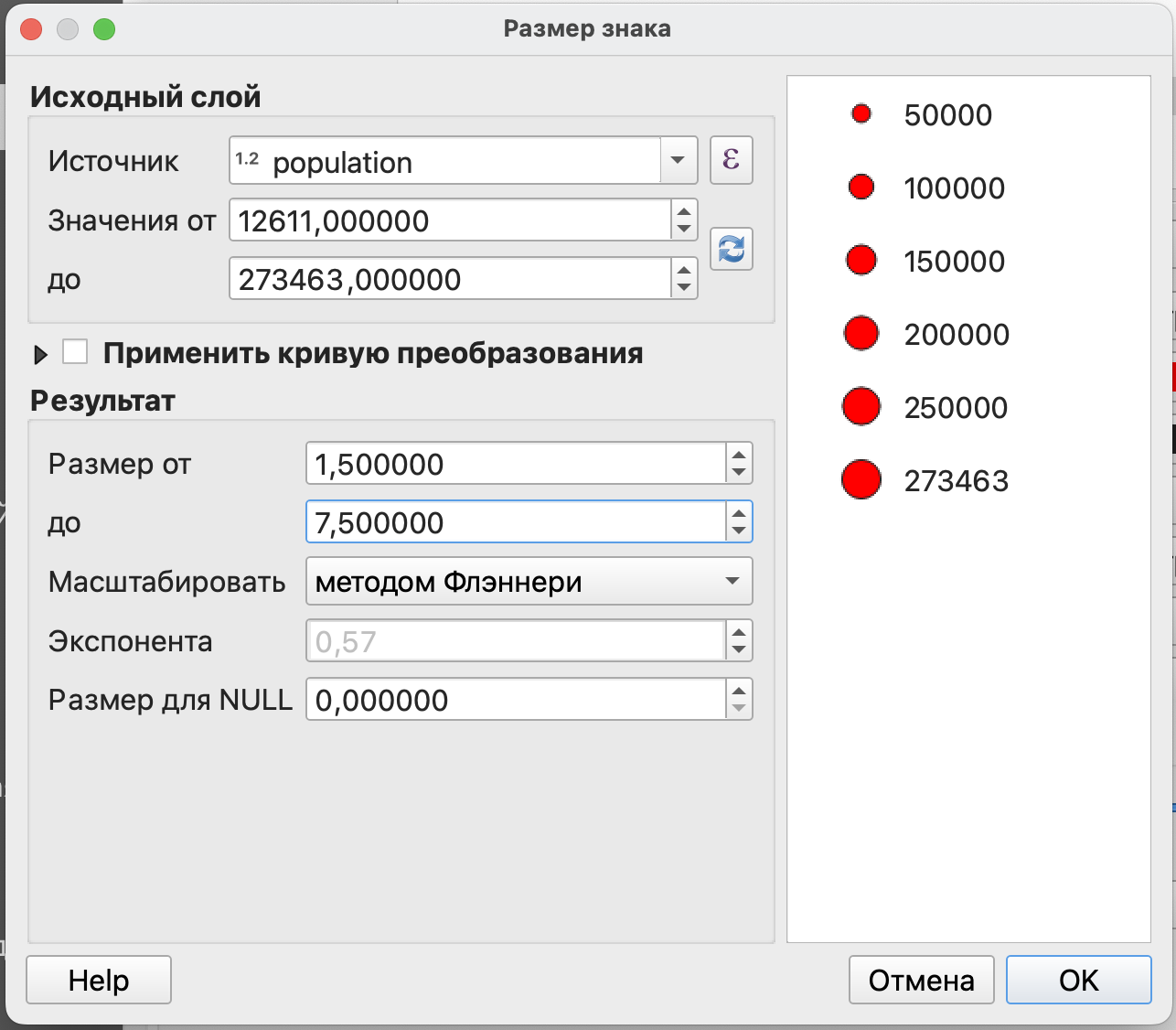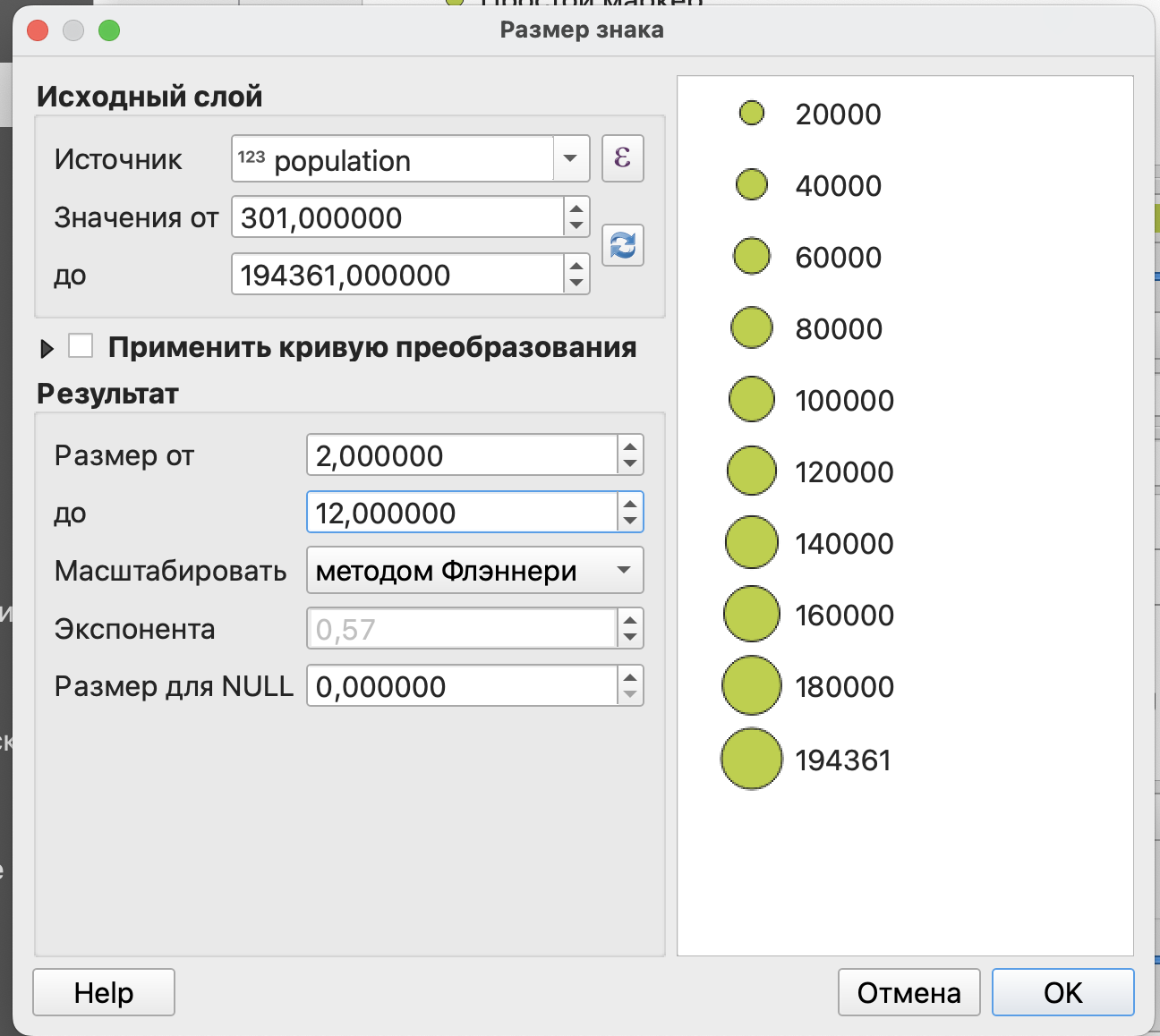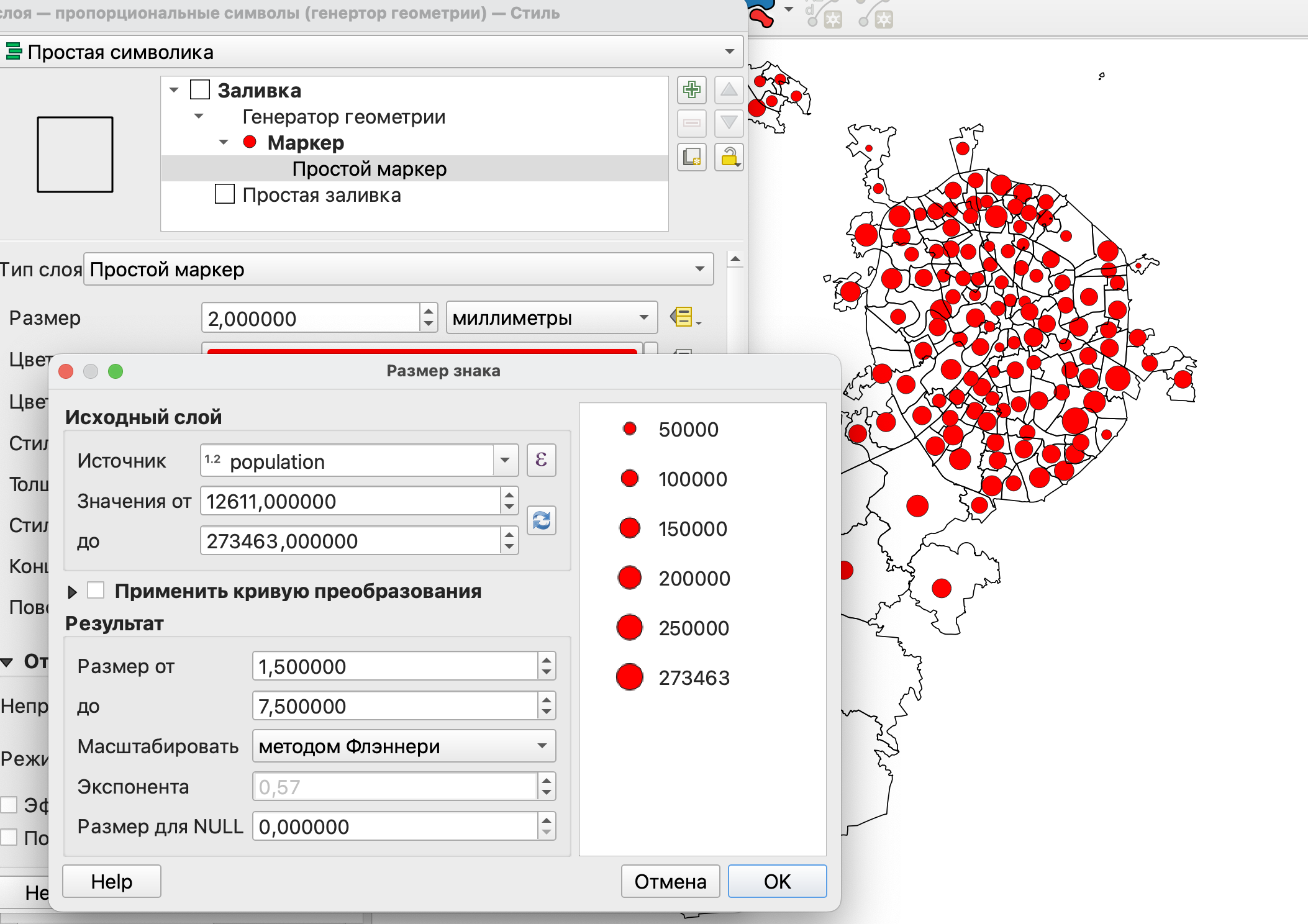 Далее нам необходимо настроить размер маркера таким образом, чтобы он отображал количество населения (поле атрибутивной таблицы “population”).