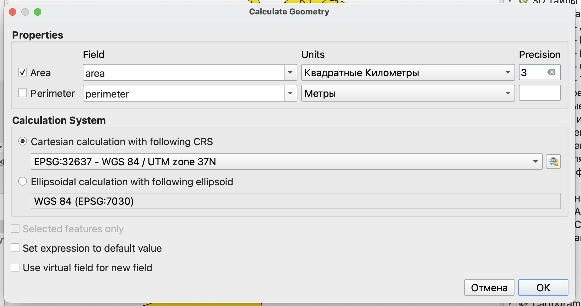 В открывшемся окне модуля выберем расчет площади area в квадратных километрах и системе координат EPSG: 32637 - UTM zone 37N.