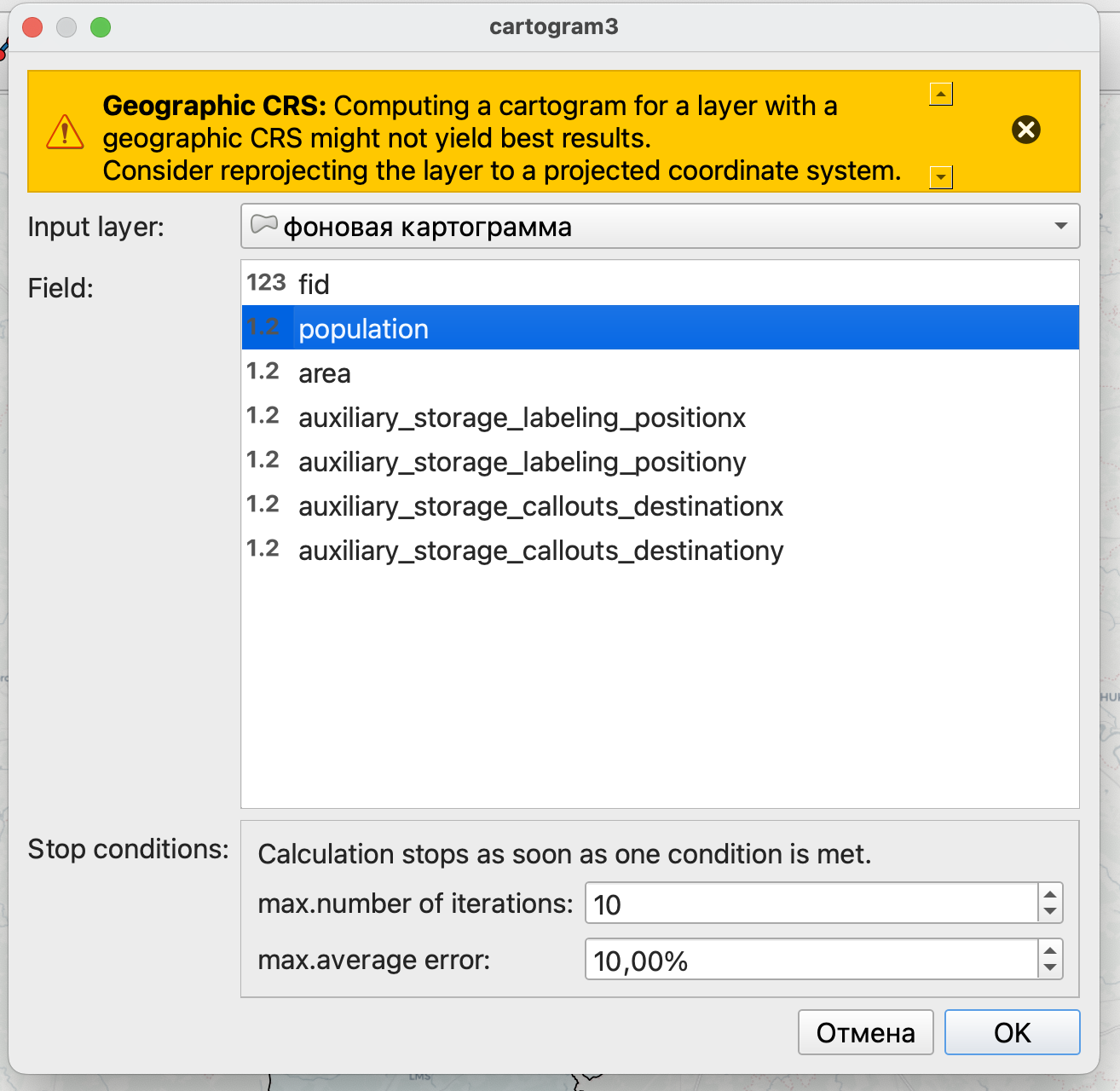 В открывшемся окне модуля необходимо выбрать слой, для которого анаморфная карта рассчитывается, показатель и указать критерии остановки (максимальное число итераций или максимальная средняя ошибка).