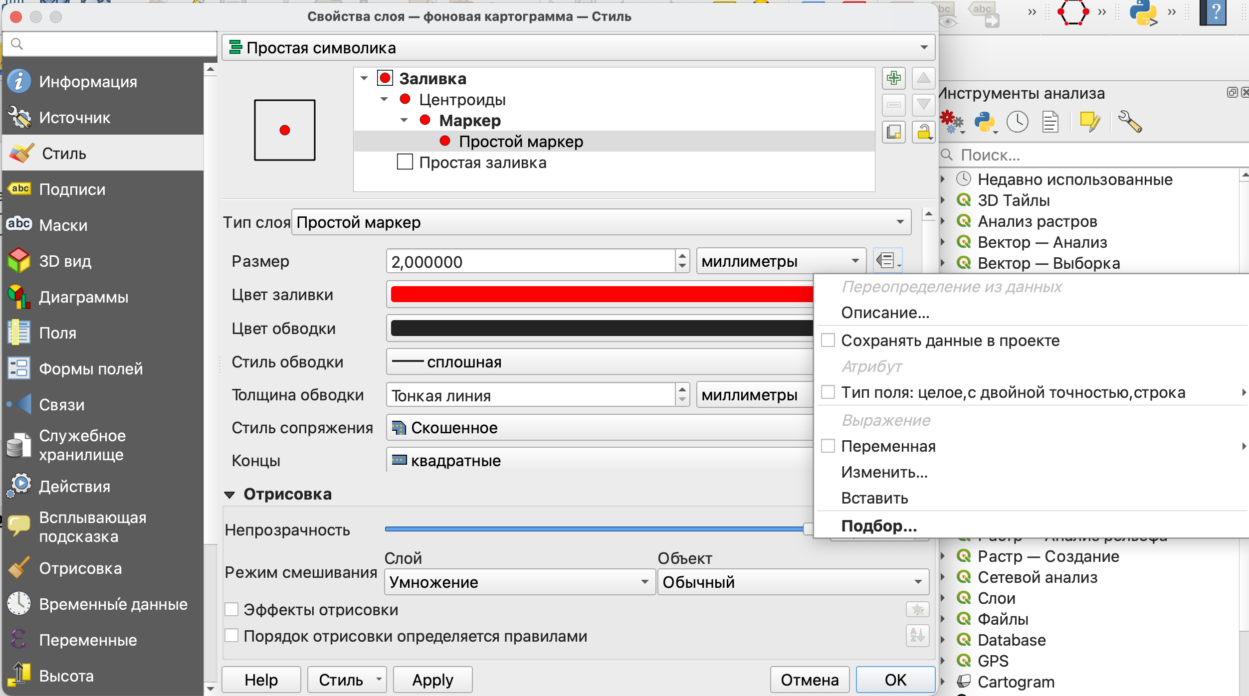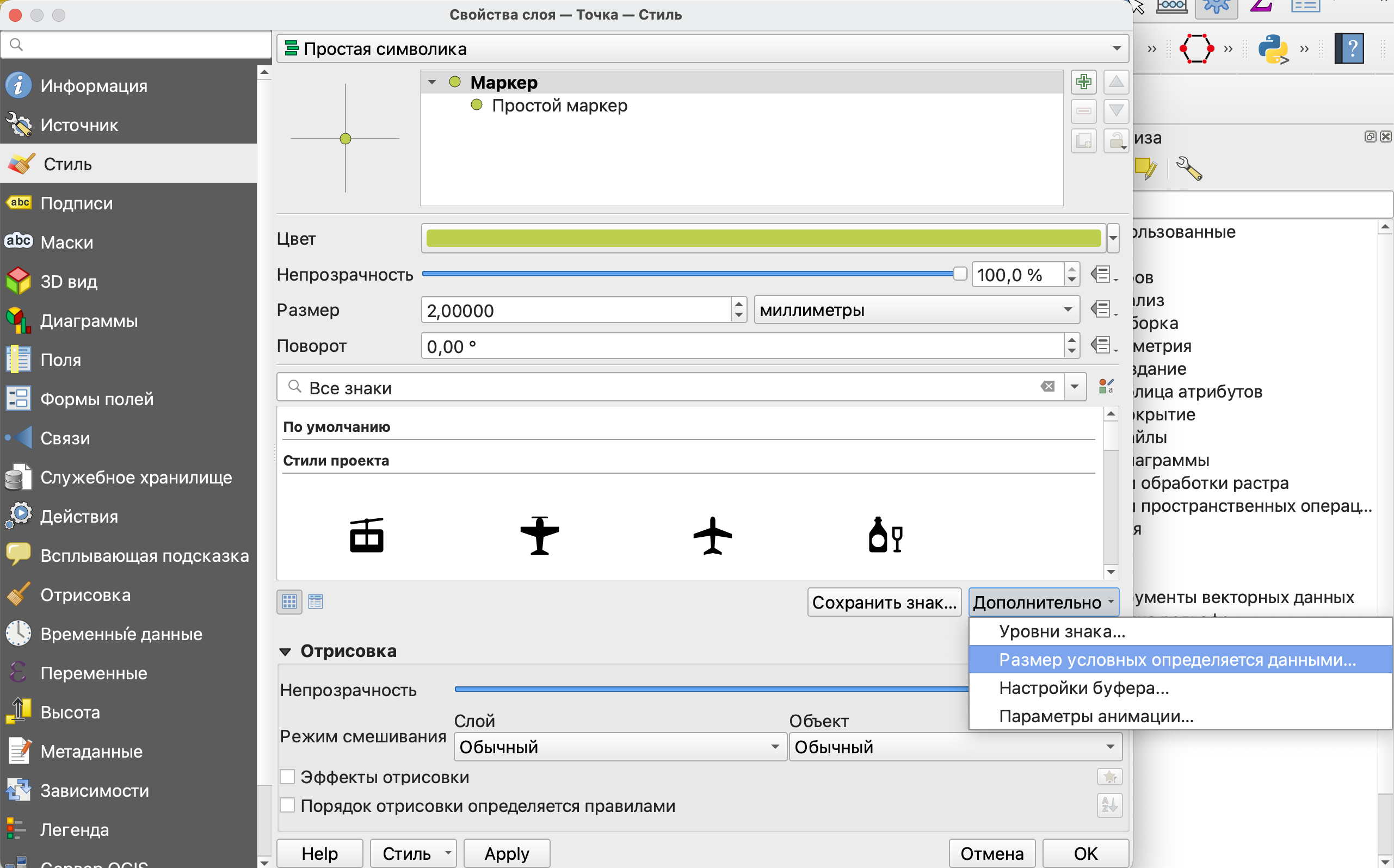 Для этого перейдем в настройки простого маркера и справа от размера нажмем кнопку Переопределить на основе данных.