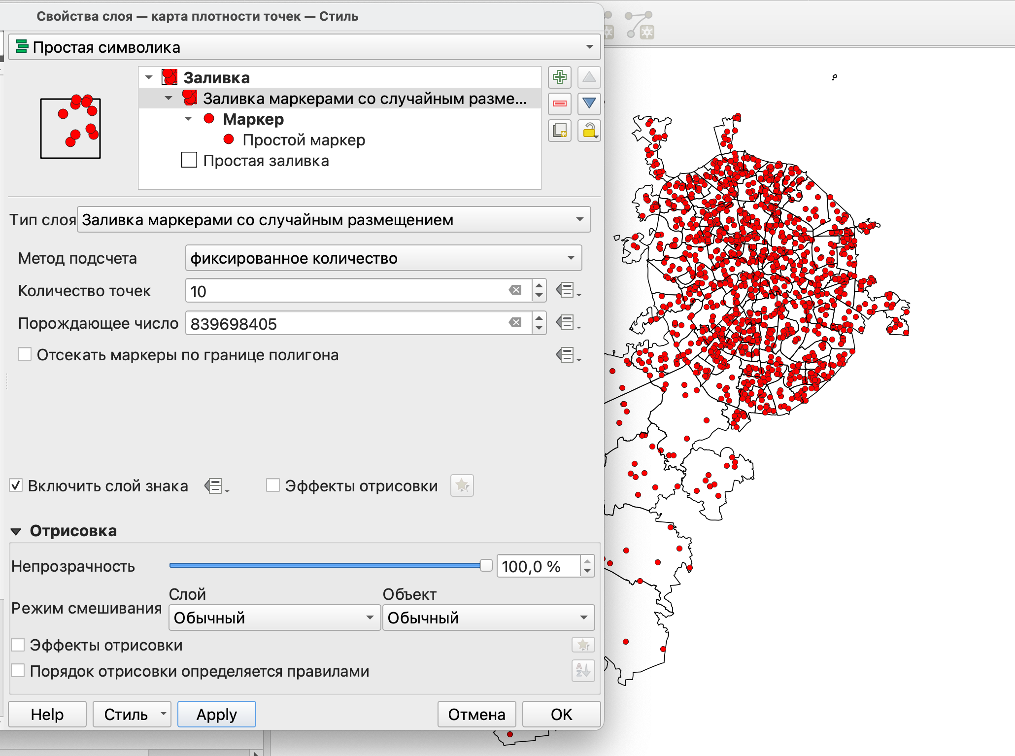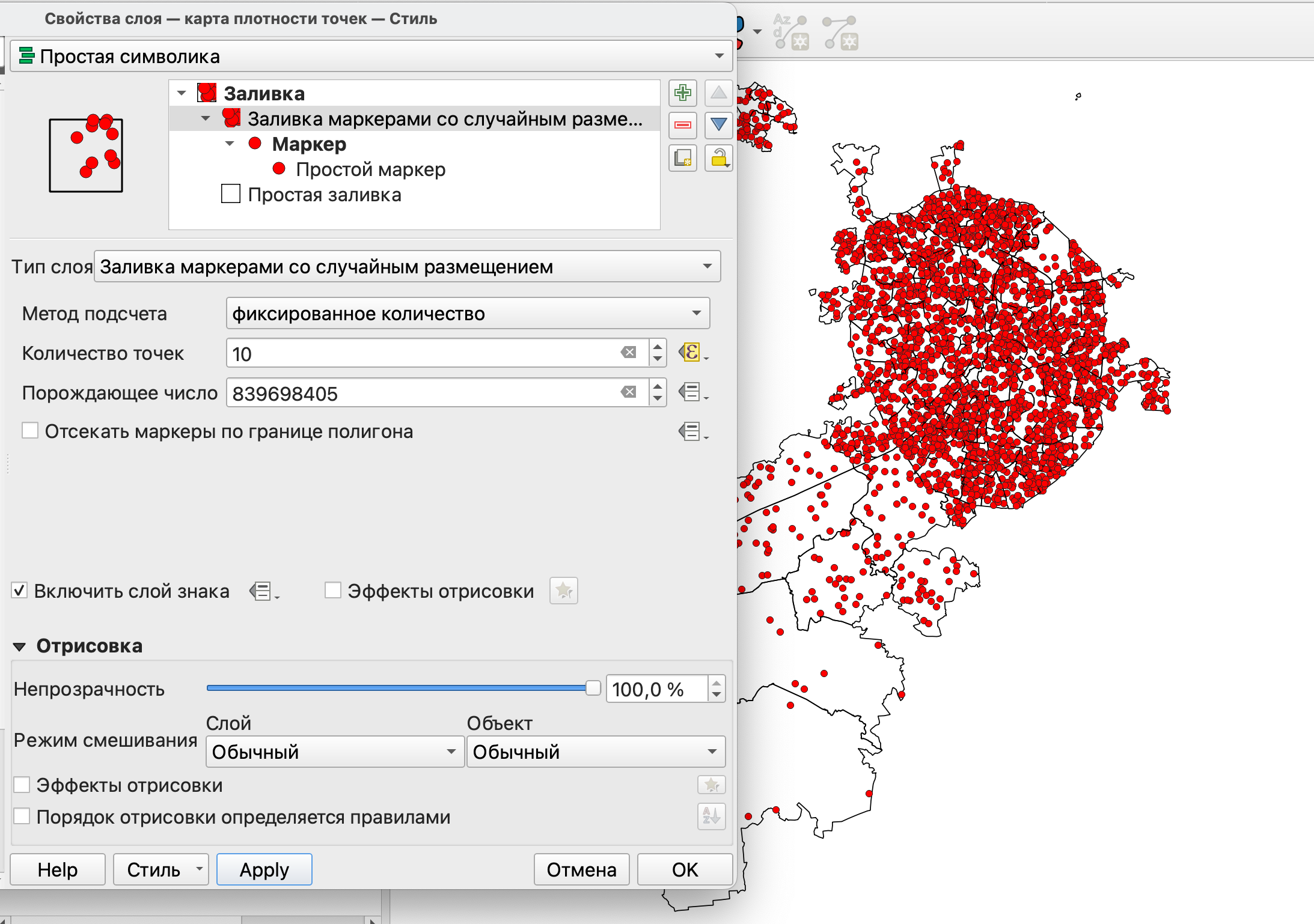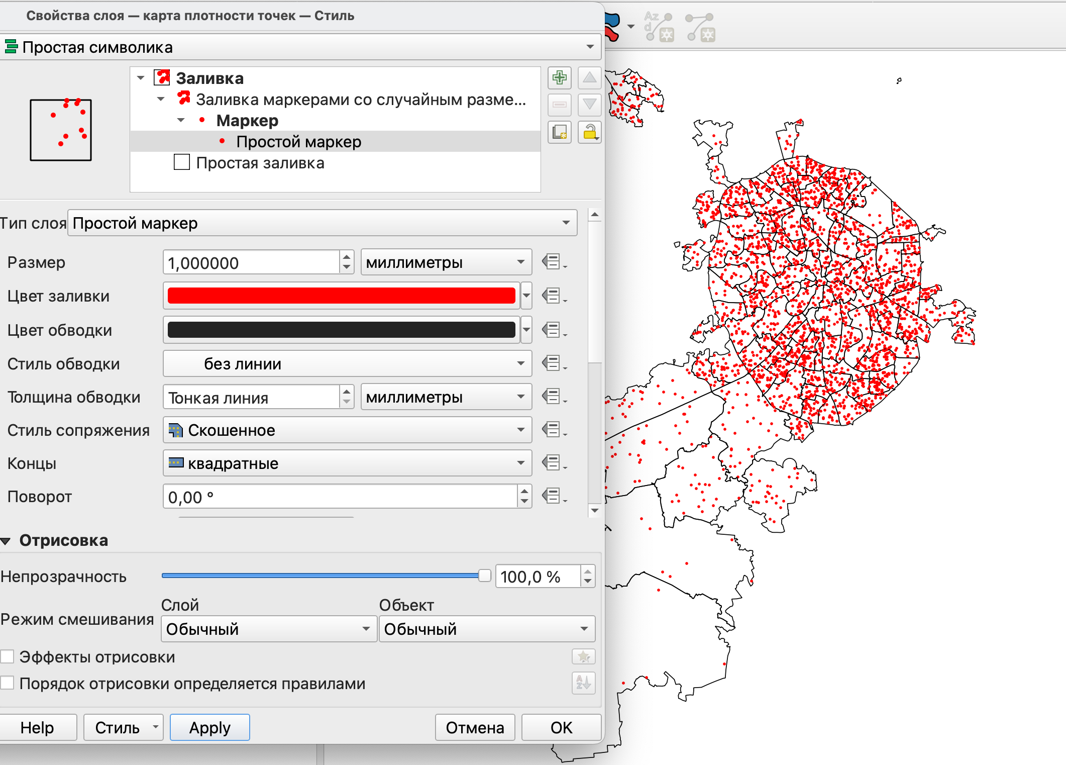 Здесь еще желательно настроить размер точек таким образом, чтобы они были хорошо различимы на карте.