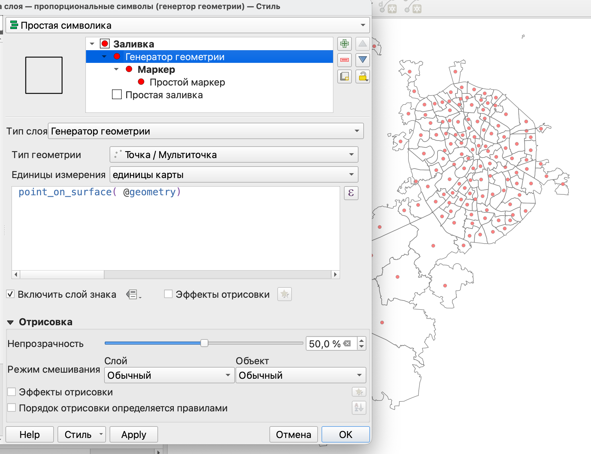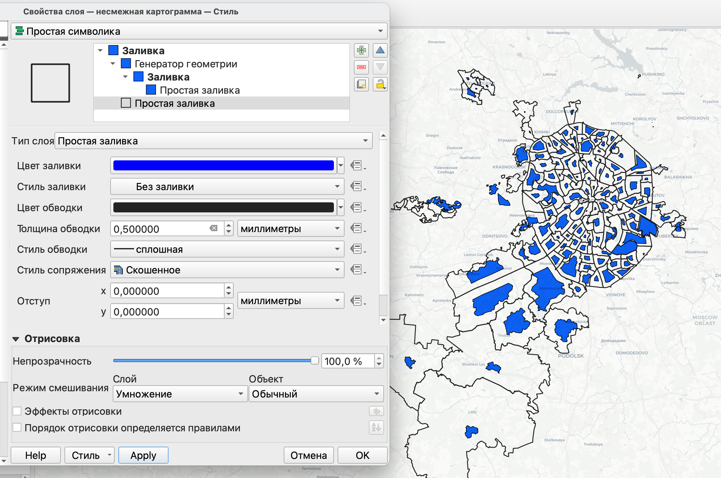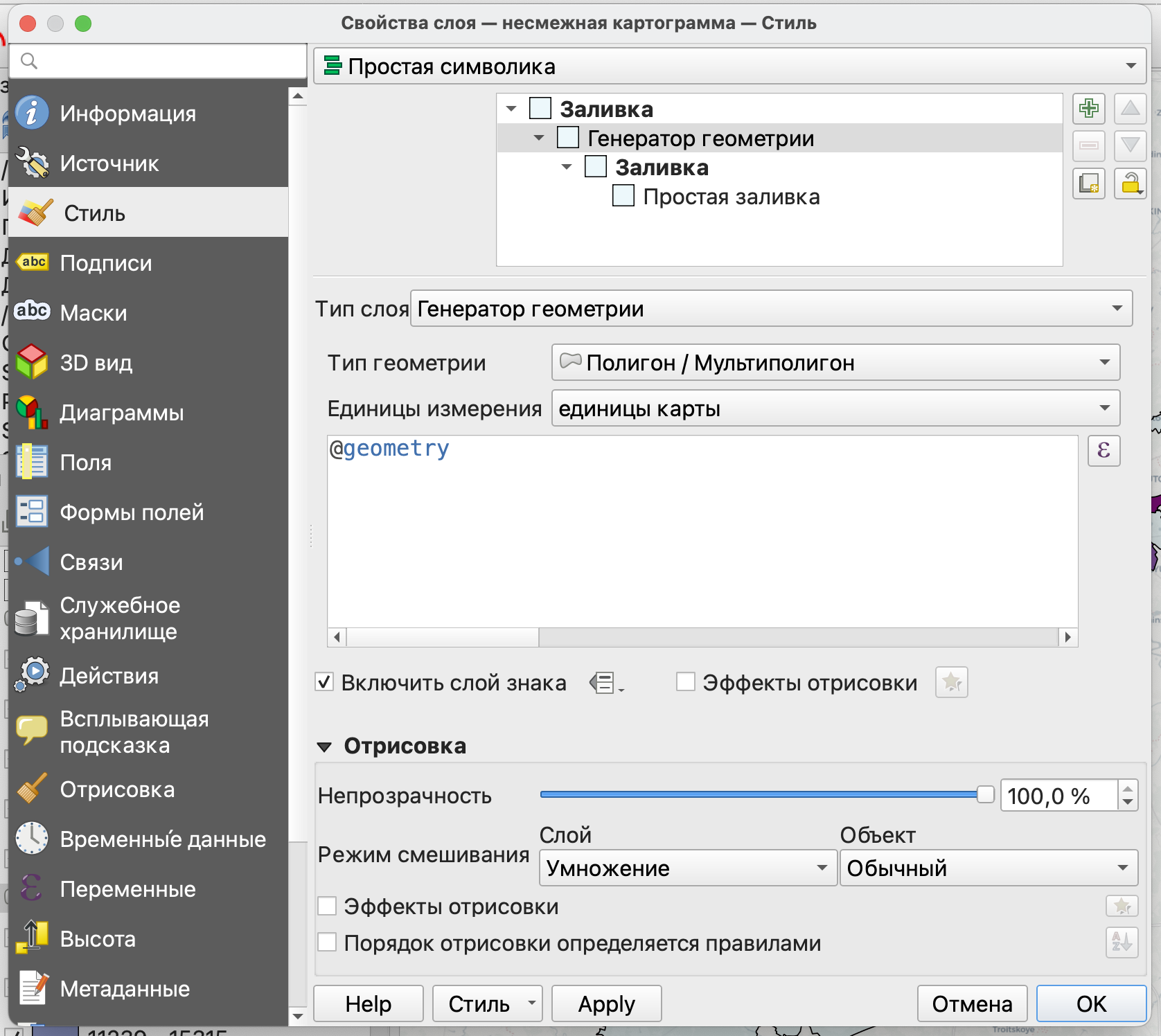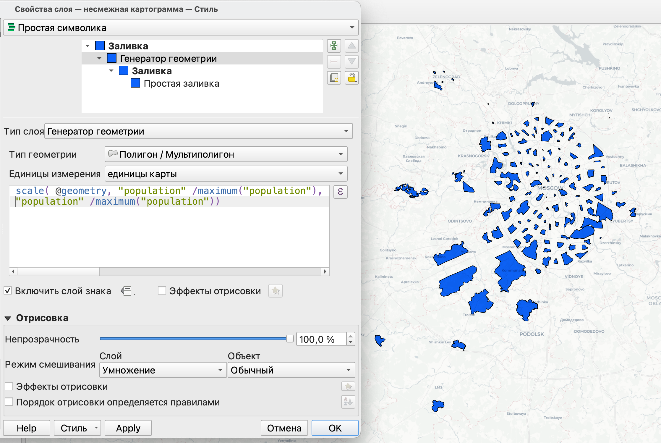 Несмежную картограмму мы создадим с использованием Генератора геометрии, которы позволяет создавать объекты с измененной геометрией на карте, не меняя геометрии в слое.