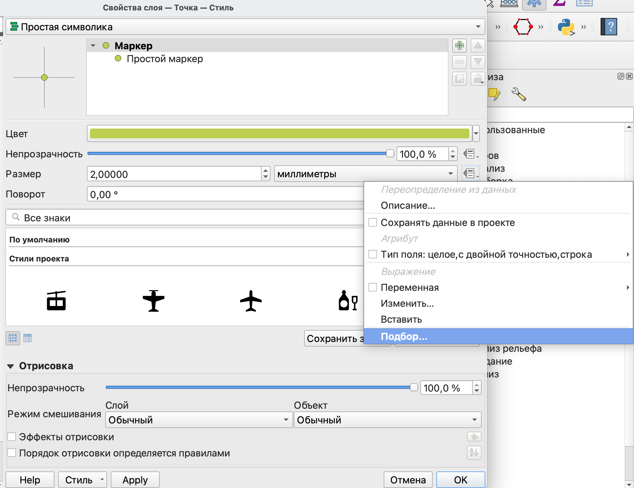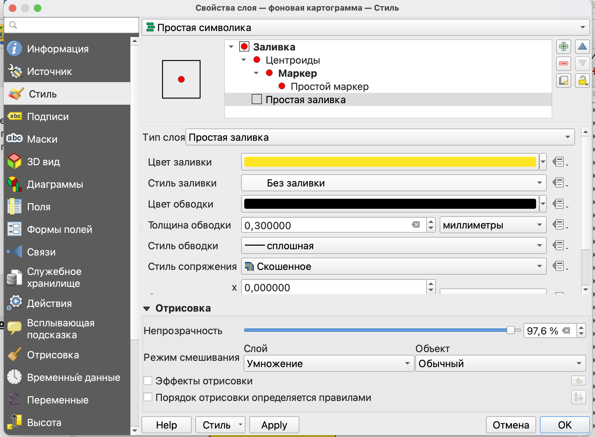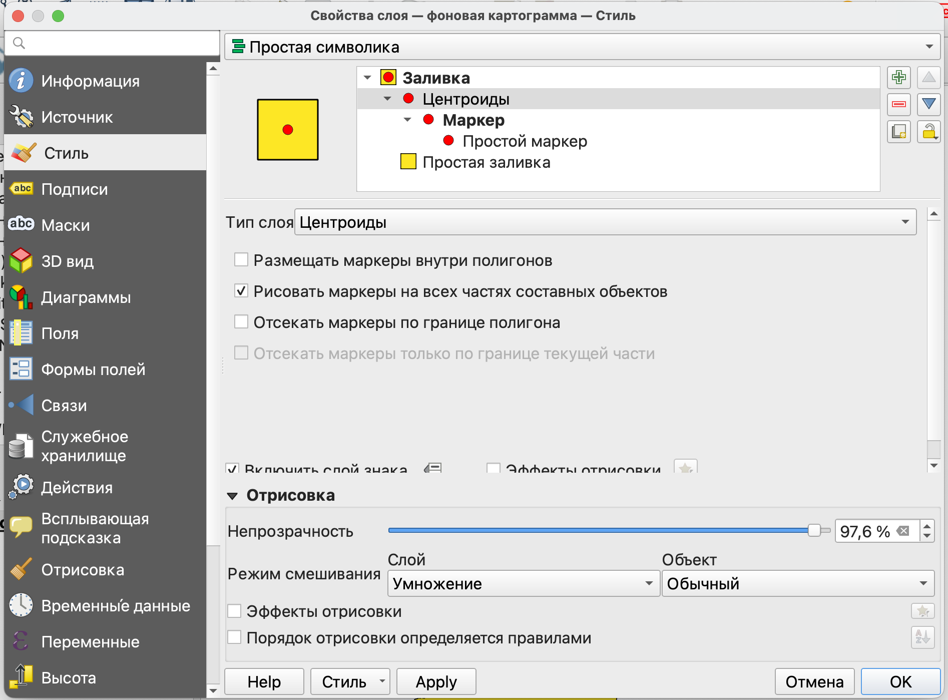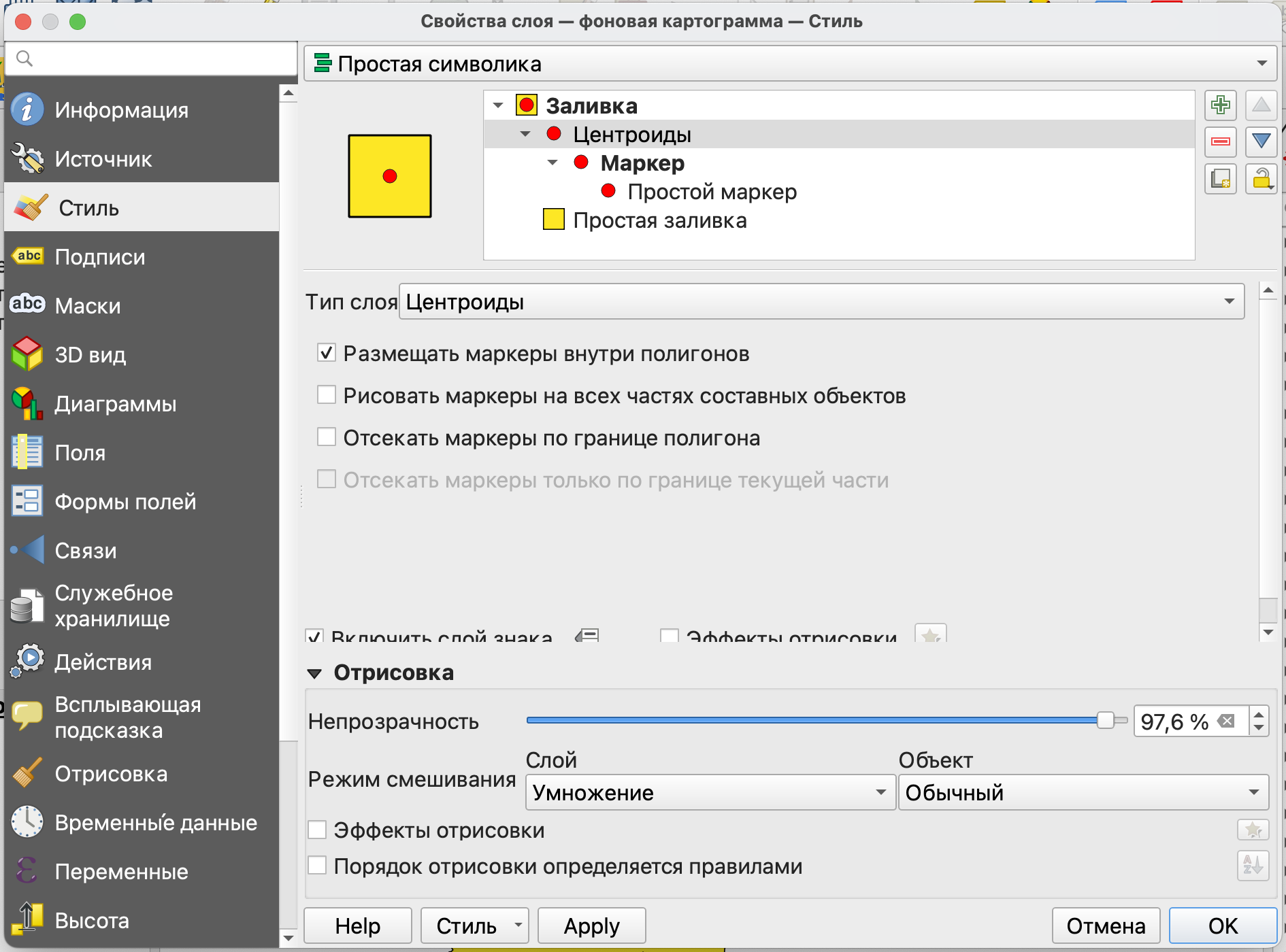 По умолчанию основным типом слоя здесь будет являться простой маркер, у которого могут быть настроены: