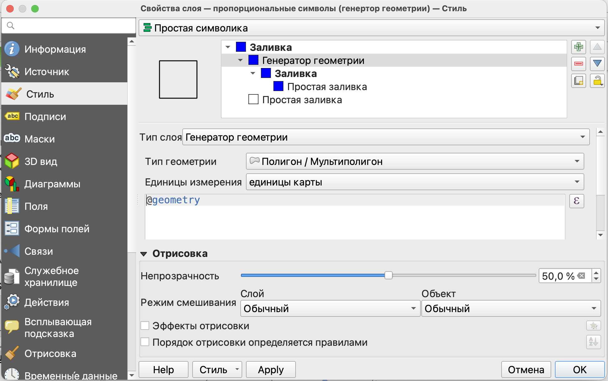 Типом слоя по умолчанию здесь, как и в предыдущих типах объектов будет являться Простая заливка, а Генератор геометрии - общим типом стиля, который подробнее рассмотрен отдельно.