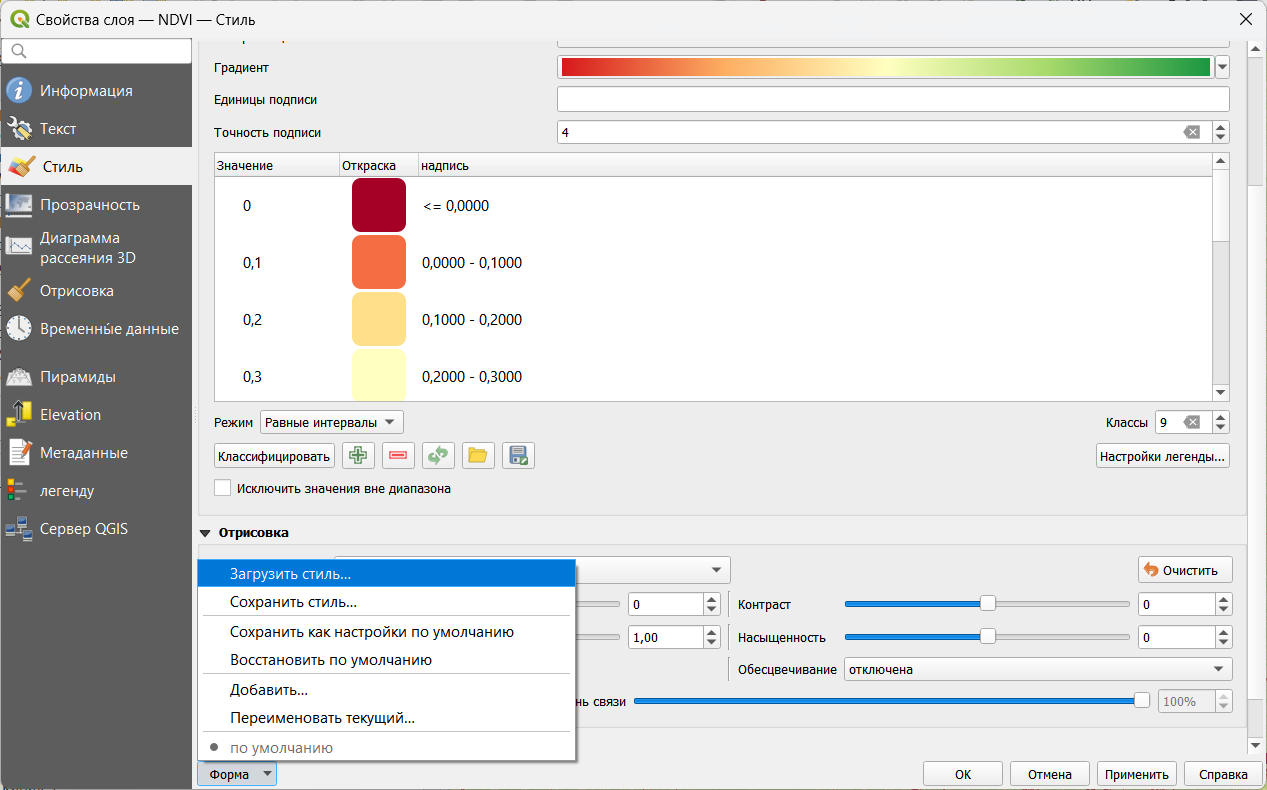 Для загрузки готового стиля необходимо открыть настройки стиля растрового слоя (либо кликнув по нему дважды левой кнопкой мыши, либо после клика правой кнопкой мыши выбрать пункт Свойства открывшегося контекстного меню). В настройках стиля следует выбрать пункт Форма - Загрузить стиль, после чего найти файл стиля и выбрать его.
